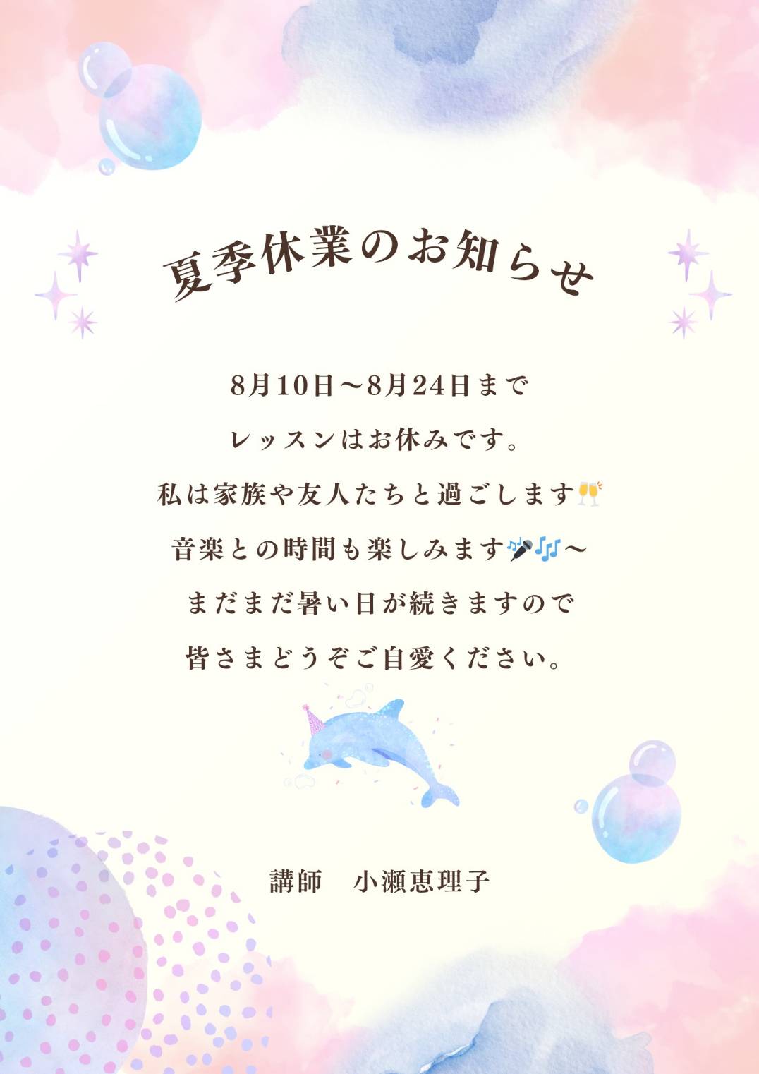 当教室は8月10日から8月24日まで夏季休業となります。